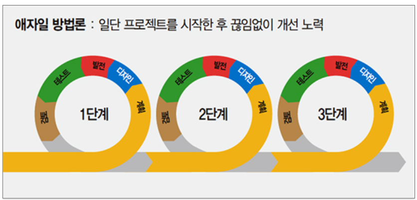 - 계획 및 분석 → 설계(디자인) → 개발(발전) → 테스트 → 검토(피드백) 순으로 반복적으로 진행