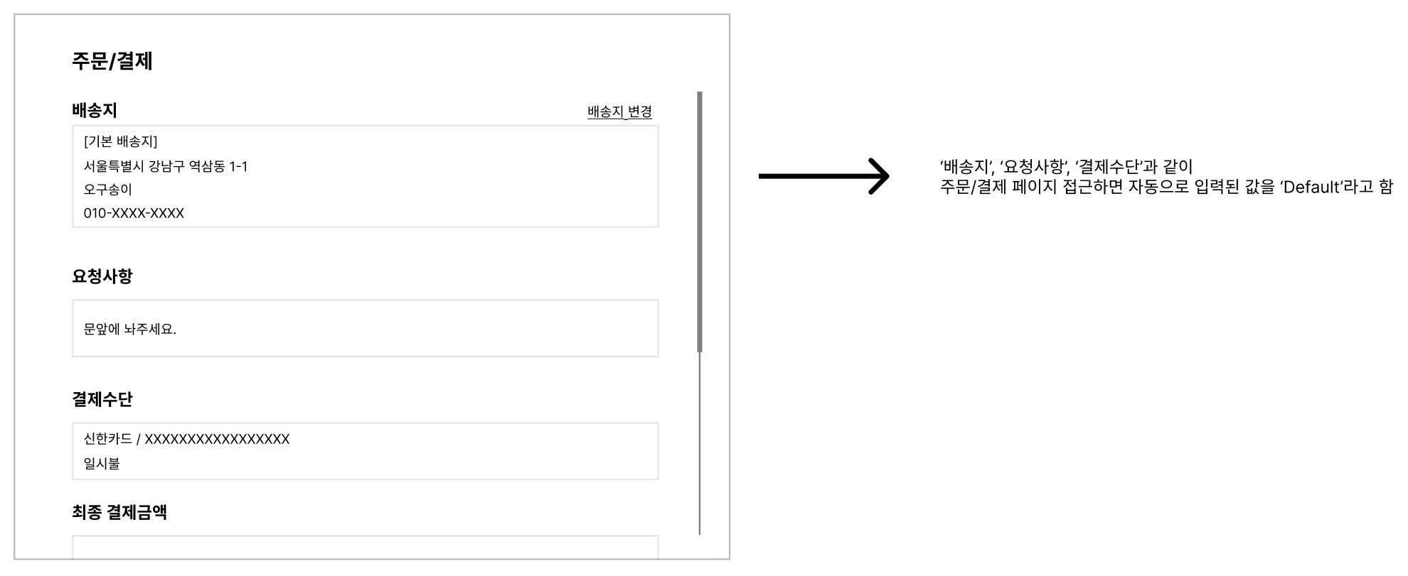 → 해석하면 '주문/결제' 페이지 접근하면 배송지는 유저가 등록한 기본 배송지를 출력한다는 의미 - 요청사항 default: '문앞에 놔주세요.' 출력