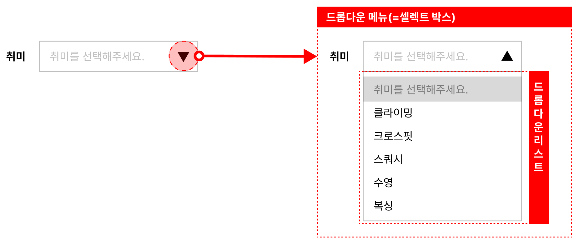 - 드롭다운 메뉴(=셀렉트 박스) 내 화살표를 누르면 출력되는 리스트를 지칭