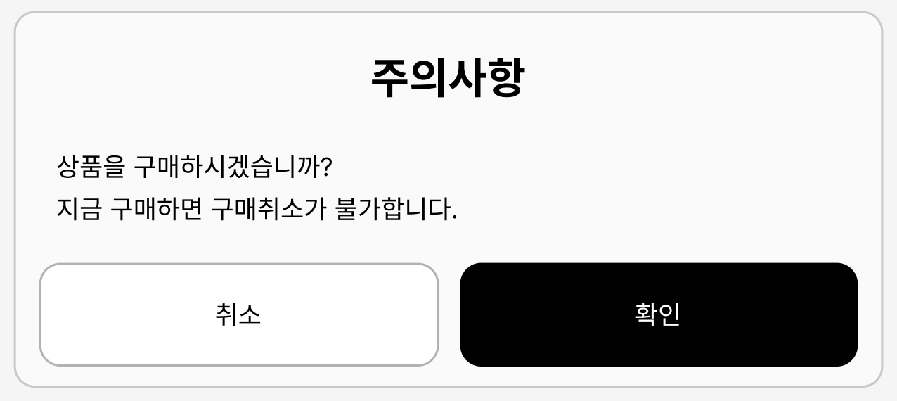 - 추가 기능: 팝업 내 텍스트 내용이 길어지거나, 짧아지더라도 [취소], [확인] 버튼은 내용 길이에 따라 자동으로 간격 조정됨