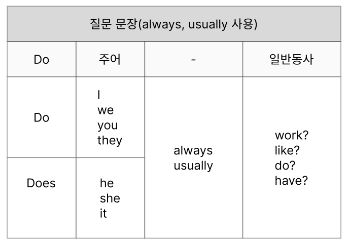 - Do(3인칭 단수인 경우 Does) + 주어 + always/usually + 일반동사 ... ?