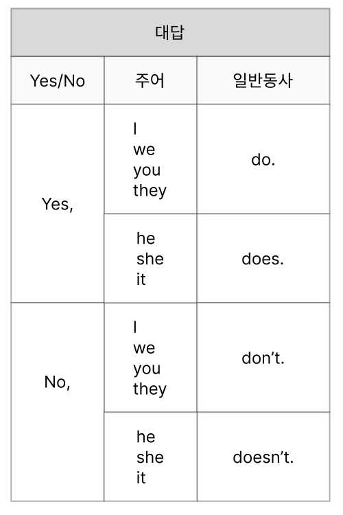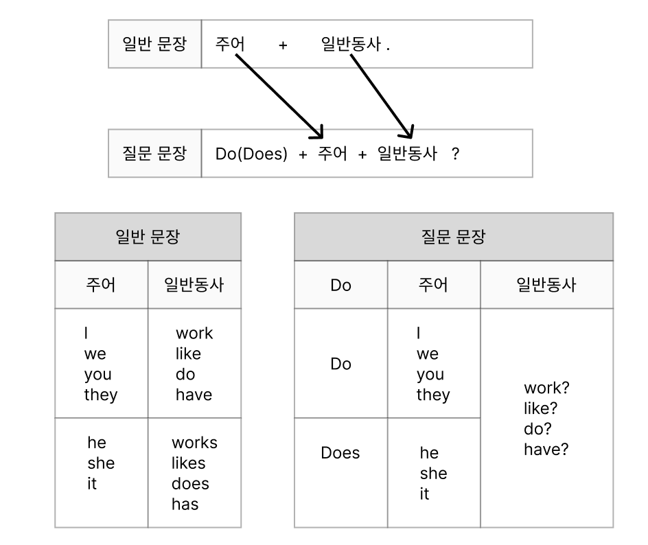 - 형태: Do(3인칭 단수인 경우 'Does') + 주어 + 일반동사 ... ?