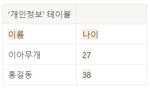 - ‘개인정보’ 테이블에서 나이가 26 초과한 행을 조회하고, ‘이름’과 ‘나이’ 칼럼만 조회