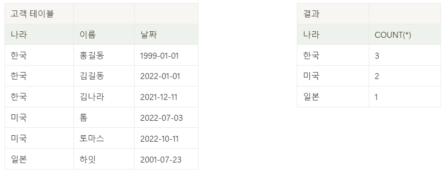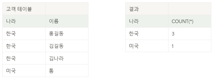 - 결과: 한국은 3개, 미국은 1개이기 때문에 ‘나라’칼럼은 ‘한국’과 ‘미국’ 출력되고 갯수가 출력