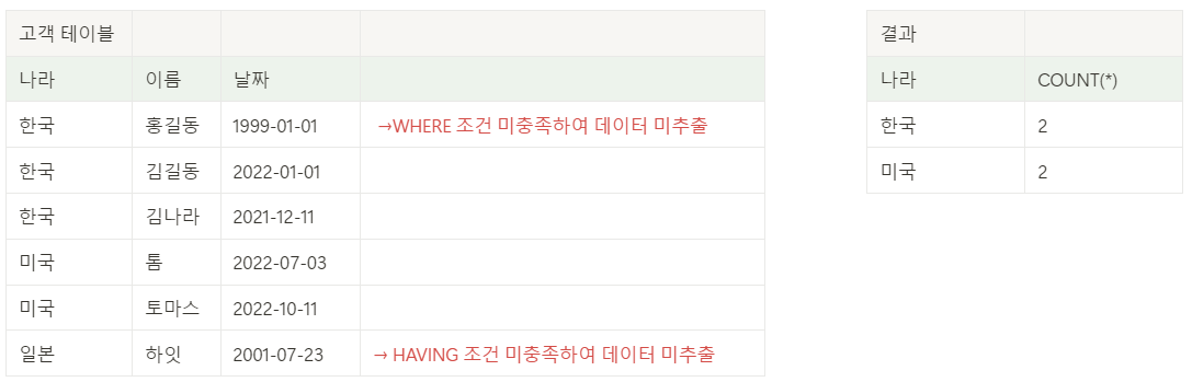 - 결과: 한국은 3개지만 홍길동은 날짜 조건 미충족하여 2개, 미국은 2개, 일본은 추출 갯수가 1개라서 HAVING 조건 미충족하여 미추출되어, 한국’과 ‘미국’ 출력되고 갯수가 각각 2로 출력