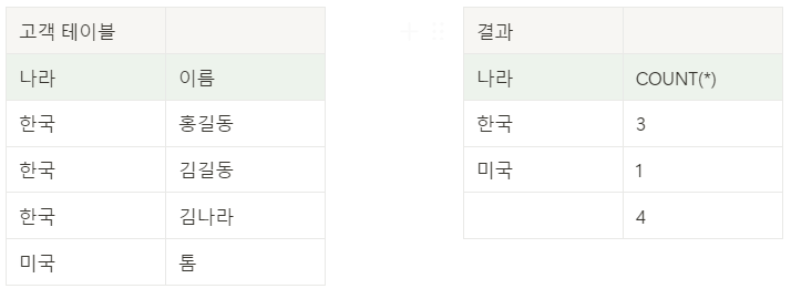 - 해석: ‘나라’로 그룹화하고, ‘나라’로 그룹핑된 갯수를 출력해라. 그리고 총 합계도 출력해라