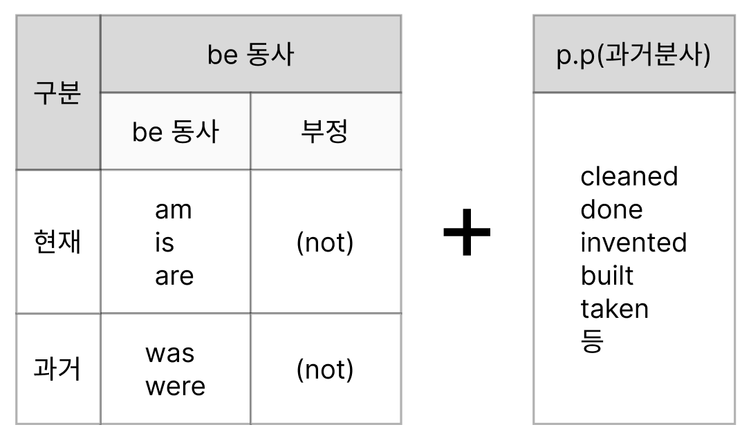 - 의미: 주어가 동작을 '받는' 형태를 의미((주어)가 (누구)에 의해 (행동)한다.)